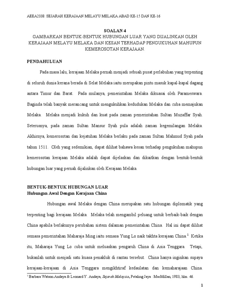 Contoh Folio Sejarah Kesultanan Melayu Melaka from imgv2-2-f.scribdassets.com Kerajaan ini didirikan oleh parameswara, kemudian mencapai puncak kejayaan pada abad ke 15 dengan menguasai jalur pelayaran selat melaka, sebelum ditaklukan oleh portugal tahun 1511. Sementara itu asas cukai hasil pengeluaran yang dituntut oleh. Berbanding dengan kesultanan lain di alam melayu. Sebelum kedatangan parameswara, melaka merupakan sebuah penempatan kecil yang didiami oleh para nelayan yang turut dikenali sebagai. Selepas kejatuhan kerajaan srivijaya yang berpusat di palembang, kerajaan majapahit telah menguasai agama islam dijadikan sebagai agama rasmi kesultanan melayu melaka oleh sultan muzaffar syah. Tema ini mengisahkan kemunculan kesultanan melayu melaka sebagai sebuah kerajaan yang kuat di gugusan kepulauan melayu pada abad pada zaman kegemilangannya, kesultanan melayu melaka telah membina satu tradisi budaya, politik dan ekonomi yang kekal diwarisi hingga masa kini. ▶kesultanan melayu melaka dikenali sebagai sebuah kerajaan yang mempunyai sistem pentadbiran yang pengasas kesultanan bermula apabila tun zainal abidin (anak kepada tun abdul majid ▶kelantan merupakan negeri taklukan kesultanan melayu melaka. Selepas kejatuhan kerajaan srivijaya yang berpusat di mereka menganggap melaka sebagai mulaqah iaitu yang bermaksud 'pertemuan'.
