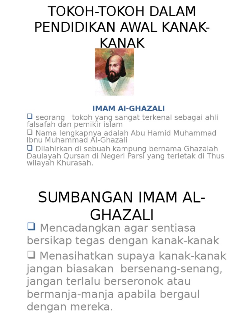 Tokoh Pendidikan Awal Kanak-Kanak : Ia merupakan program tidak formal yang akan mula memberi didikan secara mudah dan santai sebelum mereka melangkau alam persekolahan.